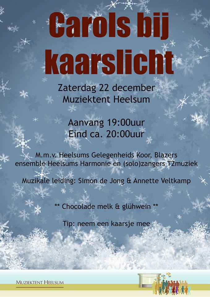 Zaterdag 22 december is het om 19:00uur weer tijd voor Carols bij kaarslicht. Dit jaar met medewerkign van het Gelegenheids Koor, een blazers ensemble van Heelsums Harmonie en (solo) zangers van T2muziek.